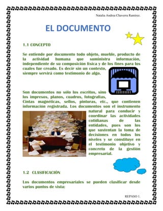 El documento define un documento como cualquier objeto que proporciona información independientemente de su forma física. Explica que los documentos no solo incluyen escritos e impresos, sino también planos, fotografías, cintas magnéticas y más. Además, clasifica los documentos por su soporte, incluyendo papel, documentos gráficos, de imagen, cintas, y otros soportes como disquetes y CDs.