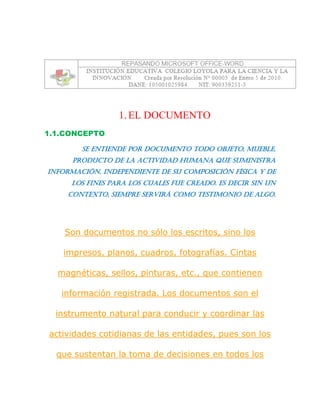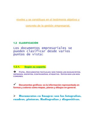 Este documento define el concepto de documento y clasifica los diferentes tipos de documentos según su soporte físico. Define un documento como cualquier objeto que proporciona información independientemente de su composición física. Luego clasifica los documentos en papel, gráficos, de imagen, cintas y otros soportes como discos.