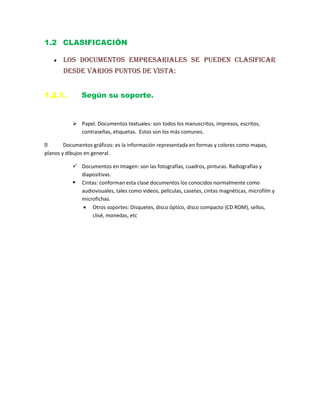 El documento define un documento como cualquier objeto que proporciona información, independientemente de su forma física o propósito. Los documentos no solo incluyen escritos e impresos, sino también planos, fotos, cintas magnéticas y más. Los documentos pueden clasificarse según su soporte, incluyendo papel, imágenes, cintas u otros soportes como discos. Los documentos empresariales son importantes porque sustentan la toma de decisiones y documentan la gestión de una empresa.