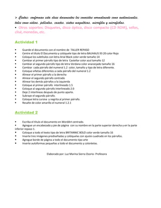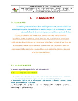 Este documento proporciona instrucciones para editar y formatear un documento de Microsoft Word sobre el concepto y clasificación de documentos. En menos de 3 oraciones, resume lo siguiente: El documento instruye al lector sobre cómo aplicar diferentes formatos de texto como tamaños y estilos de fuente, alineación, interlineado y resaltado, así como agregar encabezados, pie de página, bordes de página e imágenes para mejorar la presentación visual del documento.