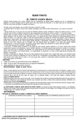 El documento presenta una fábula sobre una torcaza y un búho que eran amigos. El búho quería irse lejos porque otros se burlaban de su graznido. La torcaza lo convenció de quedarse explicándole que el problema no estaba en los demás sino en su reacción, y que debía aceptarse a sí mismo. El búho decidió quedarse y ser feliz.