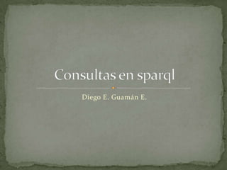 El documento contiene varias consultas SPARQL sobre diferentes temas como obras de Vivaldi, discos de heavy metal, descripción de Ecuador en diferentes idiomas, palabras con el mismo significado que Sony, Microsoft y Oracle, entre otros. También incluye consultas sobre jugadores ecuatorianos, series de televisión como Batman y de la Warner Bros, y jugadores de la Liga Deportiva Universitaria de Quito.