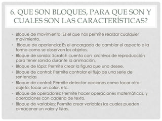 El documento describe los diferentes tipos de bloques en Scratch, incluyendo bloques de movimiento, apariencia, sonido, lápiz, control y operadores. También describe objetos, escenarios, disfraces e imágenes en Scratch. Define un algoritmo como un conjunto de pasos estructurados para resolver un problema.