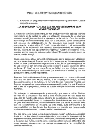 El documento presenta un texto sobre si la tecnología hará que las relaciones humanas sean menos profundas. El texto discute los beneficios y desafíos de las nuevas formas de comunicación como el chat y las redes sociales. Por un lado, estas tecnologías agilizan el trabajo y estudio al reducir los tiempos, pero también pueden limitar la profundidad de las relaciones al ser fugaces y no concretarse en la vida real. El autor concluye que estas tecnologías pueden ser positivas si se usan de forma adecuada y con conci