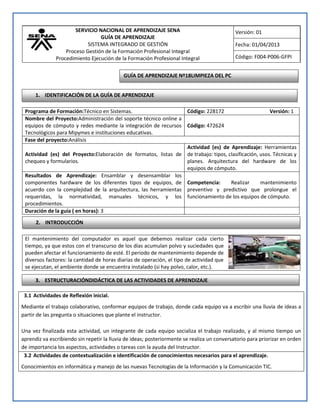 Este documento presenta una guía de aprendizaje sobre la limpieza de computadores. Incluye actividades de aprendizaje como responder preguntas sobre mantenimiento de PC, realizar informes sobre el estado inicial de un PC y sobre los procedimientos de limpieza, y limpiar ratones y teclados. El objetivo es que los aprendices adquieran habilidades para realizar mantenimiento preventivo de equipos de cómputo de manera segura y siguiendo las normas técnicas.