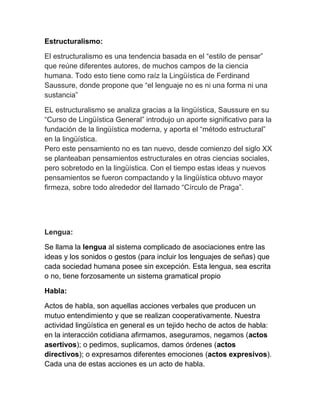 El documento resume los conceptos clave de la lingüística estructural propuesta por Ferdinand de Saussure. Explica que el signo lingüístico está compuesto por un significante (sonido o imagen) y un significado (concepto). También describe las características del signo como ser biplánico, arbitrario y lineal. Luego explica conceptos como lengua, habla, fonema, morfema y lexema. Finalmente, resume las ramas de la gramática como morfología, sintaxis, semántica y fonología.