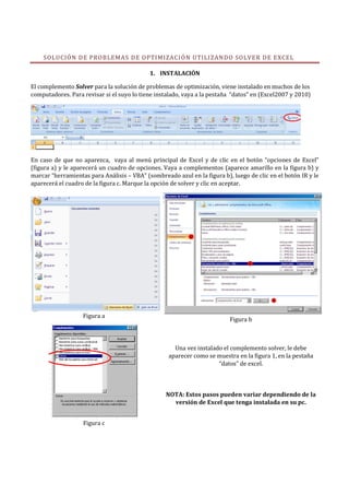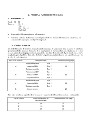 El documento describe cómo resolver problemas de optimización en Excel usando el complemento Solver. Explica cómo instalar Solver si no está disponible y proporciona dos ejemplos de problemas de optimización para resolver: 1) un problema de programación lineal que maximiza las ganancias sujeto a restricciones y 2) un problema de mezclas que maximiza las ganancias de la producción y venta de paquetes de tornillos con diferentes especificaciones.