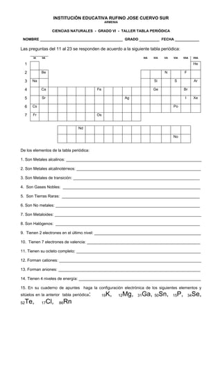 Este documento presenta un taller sobre la tabla periódica dirigido a estudiantes de grado sexto. Incluye preguntas sobre las propiedades de los elementos en la tabla periódica, como los metales alcalinos, gases nobles y metaloides. También pide que los estudiantes realicen configuraciones electrónicas de elementos y los ubiquen en la tabla, y complete tablas con números atómicos, masas y otros datos sobre elementos.