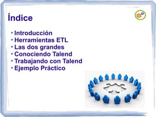 El documento presenta una guía sobre las herramientas ETL, centrándose en Talend Open Studio para la integración de datos, destacando su entorno gráfico y amplia disponibilidad de componentes. Se discuten las etapas del proceso ETL: extracción, transformación y carga, junto con una comparación entre Talend y Kettle (Pentaho). También se abordan casos de uso comunes y diferencias en velocidad y facilidad de uso entre ambas plataformas.