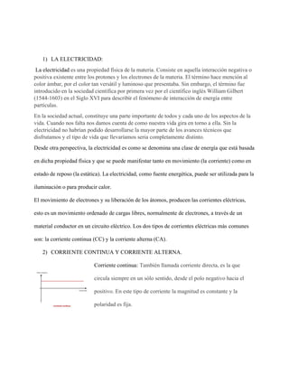 Este documento presenta información sobre conceptos básicos de electricidad como corriente continua, corriente alterna, circuitos eléctricos y sus componentes. Explica que la electricidad es una propiedad de la materia que permite la interacción entre electrones y protones. Describe los diferentes tipos de corrientes eléctricas, elementos de un circuito como generadores, conductores y receptores, y los diferentes tipos de circuitos como serie y paralelo. También cubre conceptos como transporte de electricidad, ley de Ohm y ley de Watt.