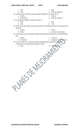 El documento presenta 20 preguntas sobre conceptos contables relacionados con elementos patrimoniales como activos, pasivos y patrimonio neto, así como sobre temas de IVA, compras y ventas, clientes y proveedores. Las preguntas buscan identificar si diferentes elementos pertenecen a activos, pasivos, patrimonio o ninguno; y aclarar situaciones sobre facturación de IVA y registro contable de compras, ventas y deudores.