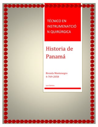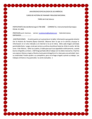 Este documento presenta una tarea asignada a un estudiante sobre la historia de Panamá. La tarea incluye preguntas sobre conceptos clave como la Leyenda Negra, la Brevísima Relación de la Destrucción de las Indias de Bartolomé de Las Casas, y el Sermón de Montesinos. El estudiante debe responder las preguntas buscando información en línea o en bibliotecas e incluir imágenes editadas. La tarea debe enviarse al profesor antes de una fecha límite para su evaluación.