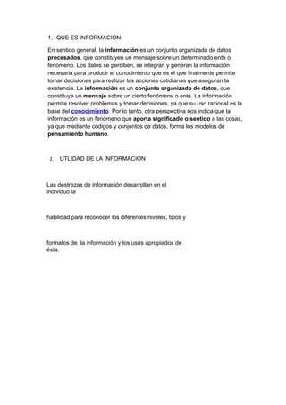 El documento define la información como un conjunto organizado de datos procesados que constituyen un mensaje sobre un determinado ente o fenómeno. Explica que la información permite resolver problemas y tomar decisiones al aportar significado a los datos. Finalmente, detalla algunos tipos de información como la general, específica y los medios de comunicación como el correo electrónico, páginas web, chats y otros.