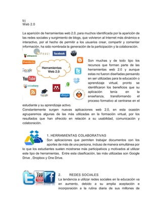 1. El documento compara las TICs tradicionales y las NTICs, destacando que las NTICs incluyen herramientas como páginas web educativas y foros que permiten una mayor interactividad. También describe las características de la Web 2.0 como redes sociales y blogs que permiten a los usuarios crear y compartir contenido de forma colaborativa. Finalmente, explica que la Web 3.0 se centra en aplicaciones con tecnologías como AJAX que permiten una mayor personalización en distintos dispositivos a través de datos