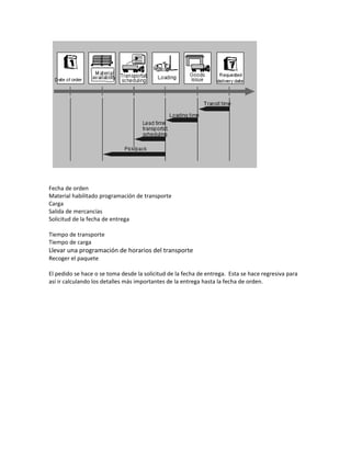 El documento describe las etapas del proceso de transporte de mercancías, incluyendo la fecha de orden, programación del transporte, carga, salida de mercancías y solicitud de fecha de entrega. También menciona videos sobre obras de infraestructura vial colombiana como puentes, túneles y doble calzada que mejoran el transporte de carga en el país.