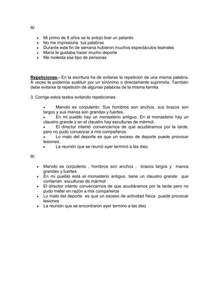 El documento proporciona instrucciones sobre cómo corregir diferentes errores gramaticales y mejorar el estilo de escritura en español. Se presentan varios ejemplos de oraciones con errores y se pide reescribirlos de forma correcta siguiendo las indicaciones proporcionadas sobre orden sintáctico, concordancia, repeticiones, conjunciones, adverbios, adjetivos, proposiciones de relativo y precisión expresiva.