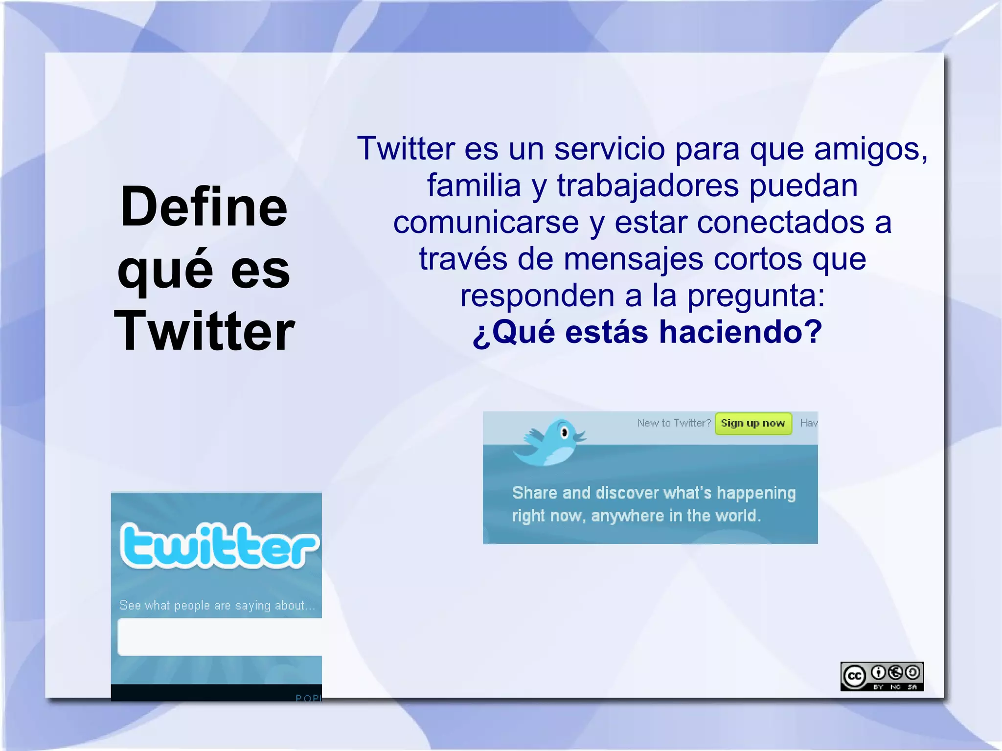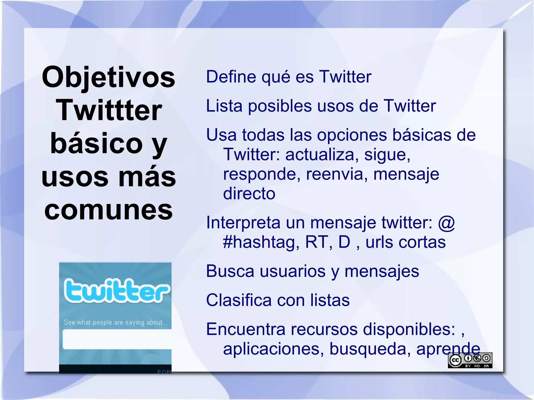 El documento resume los usos básicos de Twitter, incluyendo actualizar, seguir, responder y reenviar mensajes, así como enviar mensajes directos. Explica cómo interpretar elementos como @, #, RT y URLs cortas en los tweets. Además, menciona opciones para buscar usuarios y mensajes, clasificar con listas, y encontrar aplicaciones y recursos de aprendizaje para mejorar el uso de Twitter.