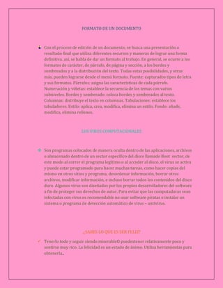 El documento describe los diferentes formatos que se pueden aplicar a un documento, incluyendo formatos de fuente, párrafo, página, sección, bordes, sombreados y distribución de columnas. Explica que estos formatos se pueden configurar desde el menú de formato y permiten lograr una presentación final definida.
