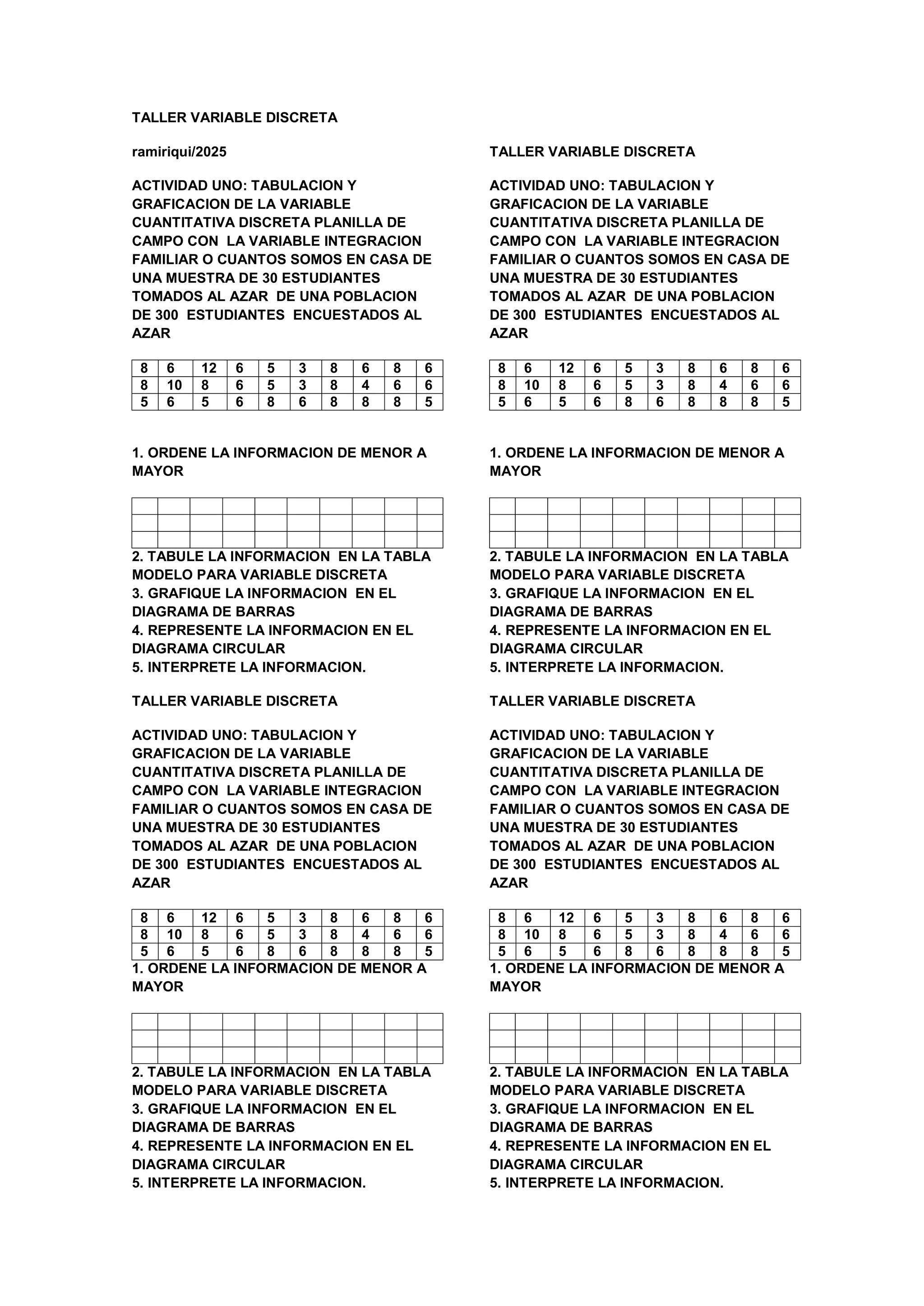 El documento describe una actividad de un taller sobre variables discretas que involucra tabular y graficar datos sobre la variable de integración familiar de 30 estudiantes encuestados, ordenar los datos, representarlos en una tabla y diagramas de barras y circulares, e interpretar la información.