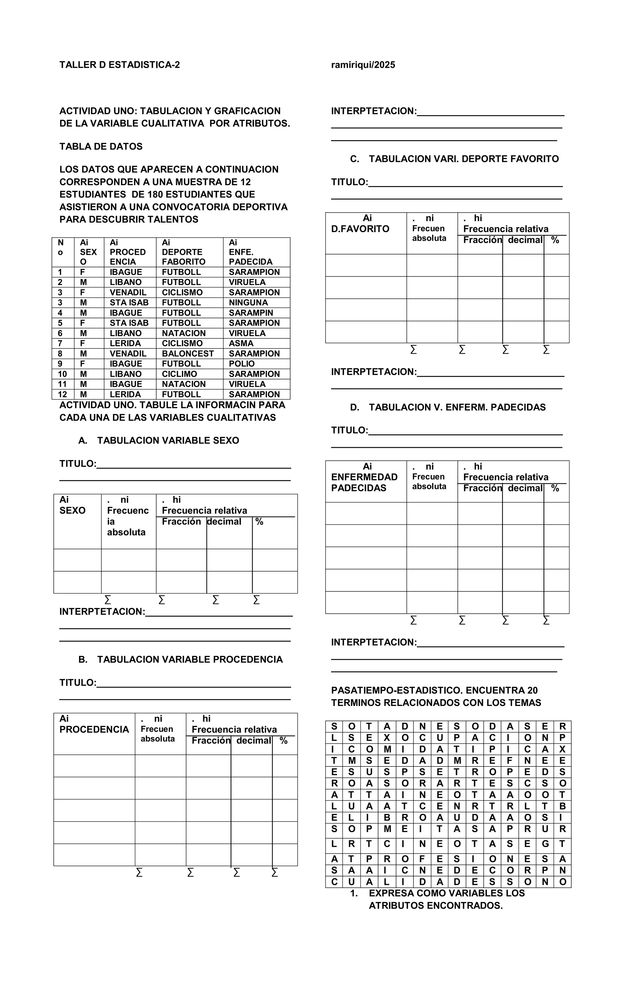 El documento presenta una actividad estadística sobre la tabulación y graficación de variables cualitativas tomadas de una muestra de 12 estudiantes. Se pide tabular las variables sexo, procedencia, deporte favorito y enfermedad padecida y calcular las frecuencias absolutas y relativas de cada categoría. Adicionalmente, se incluye un pasatiempo sobre encontrar términos relacionados con estadística en una sopa de letras.