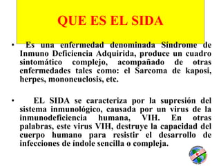 El documento describe el SIDA y el VIH, cómo se transmiten, los síntomas y cómo prevenirlos. El SIDA es causado por el virus VIH y suprime el sistema inmunológico, dejando al cuerpo vulnerable a infecciones. Se transmite principalmente a través de relaciones sexuales sin protección, transfusiones de sangre y de madre a hijo. Las personas infectadas con VIH pueden parecer sanas pero transmitir el virus. No existe cura, pero la educación y el uso correcto de condones pueden prevenir su propagación.