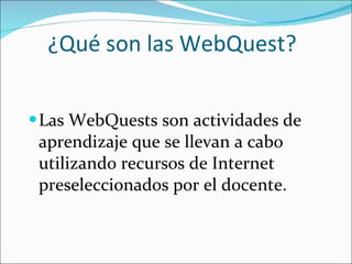 ¿Qué son lasWebQuest? Las WebQuests son actividades de aprendizaje que se llevan a cabo utilizando recursos de Internet preseleccionados por el docente.