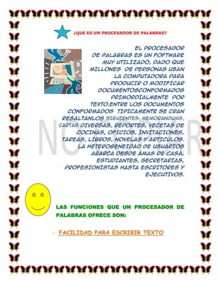 Un procesador de palabras es un software que permite crear, editar y dar formato a documentos compuestos principalmente por texto, como cartas, informes, artículos, libros y más. Ofrece funciones como facilidad para escribir, editar y corregir texto, cambiar el formato e imprimir documentos de manera fácil. La creación de un documento generalmente involucra cuatro etapas: planeación y creación del contenido, edición del texto, darle formato y finalmente imprimirlo.