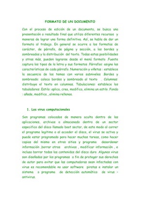 El documento describe los diferentes formatos que se pueden aplicar a un documento, incluyendo formato de fuente, párrafo, página, sección, bordes, sombreado y distribución de columnas. Todas estas opciones de formato se pueden acceder desde el menú formato.
