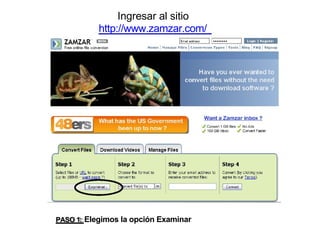 Este documento proporciona instrucciones paso a paso para convertir un video en otro formato utilizando el sitio web Zamzar. Explica cómo navegar al sitio, seleccionar el video a convertir desde la computadora, elegir el nuevo formato, ingresar la dirección de correo electrónico, iniciar la conversión y descargar el video convertido desde el correo electrónico.