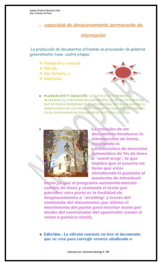 Este documento describe qué es un procesador de palabras y sus funciones principales. Explica que un procesador de palabras es un software que permite crear, editar y dar formato a documentos de texto. Enumera las funciones básicas como escribir, agregar, borrar o mover texto, corregir errores, cambiar formato e imprimir. También describe las cuatro etapas típicas de la producción de un documento: planeación, creación, edición y formato, e impresión.