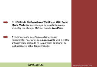 Este documento describe un taller de formación sobre diseño web con WordPress, posicionamiento SEO y community manager. El taller dura 45 horas divididas en 3 módulos y enseña a desarrollar sitios web, optimizar el posicionamiento en buscadores y realizar campañas en redes sociales. El objetivo es proporcionar los conocimientos necesarios para crear y gestionar proyectos digitales de manera profesional.