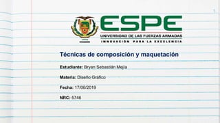 Este documento describe varias técnicas de composición y maquetación gráfica, incluyendo el uso del espacio, proporciones, forma, tamaño, escala, equilibrio, simetría, diagramación y contraste. Explica conceptos como la sensación de peso visual que transmiten los elementos en función de su posición, y la importancia de lograr un equilibrio en la composición a través de estas técnicas.
