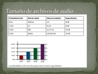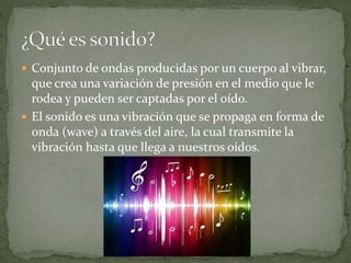 El sonido se produce por la vibración de un cuerpo y se transmite a través de ondas. Las ondas de sonido tienen amplitud, frecuencia, velocidad y longitud de onda. Existen tres características de percepción del sonido - tono, intensidad y timbre - que corresponden a las características físicas de frecuencia, amplitud y composición armónica.