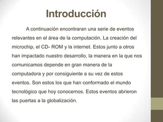 Este documento resume tres eventos clave en la historia de la computación: la creación del microchip en 1958, que hizo que las computadoras fueran más pequeñas, rápidas y eficientes, permitiendo las computadoras personales; la creación del CD-ROM en 1979, que permitió almacenar más datos a bajo costo y alta velocidad; y la creación de Internet en 1969, que junto con los otros eventos han impactado la comunicación humana y llevado a la globalización.