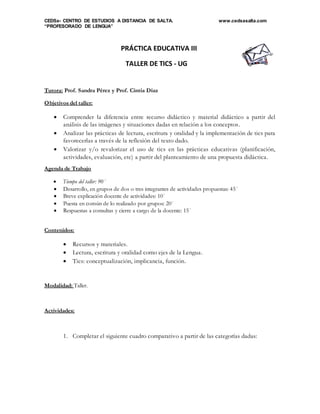 Este documento presenta la agenda y actividades de un taller sobre Tecnologías de la Información y la Comunicación (TICs) dirigido a estudiantes de profesorado de lengua. El taller busca que los estudiantes comprendan la diferencia entre recursos y materiales didácticos, analicen las prácticas de lectura, escritura y oralidad e implementen el uso de TICs. Las actividades incluyen completar cuadros comparativos, identificar recursos y materiales en imágenes, debatir sobre la importancia de las TICs en
