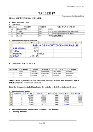 Este documento proporciona instrucciones para crear una tabla en Excel que calcula la amortización de un préstamo de $15,000 al 12% anual durante 5 años. Muestra cómo ingresar los valores iniciales, fórmulas para calcular los pagos, capital e interés cada período, y el saldo final. El usuario puede modificar los valores iniciales y analizar cómo cambian los cálculos.