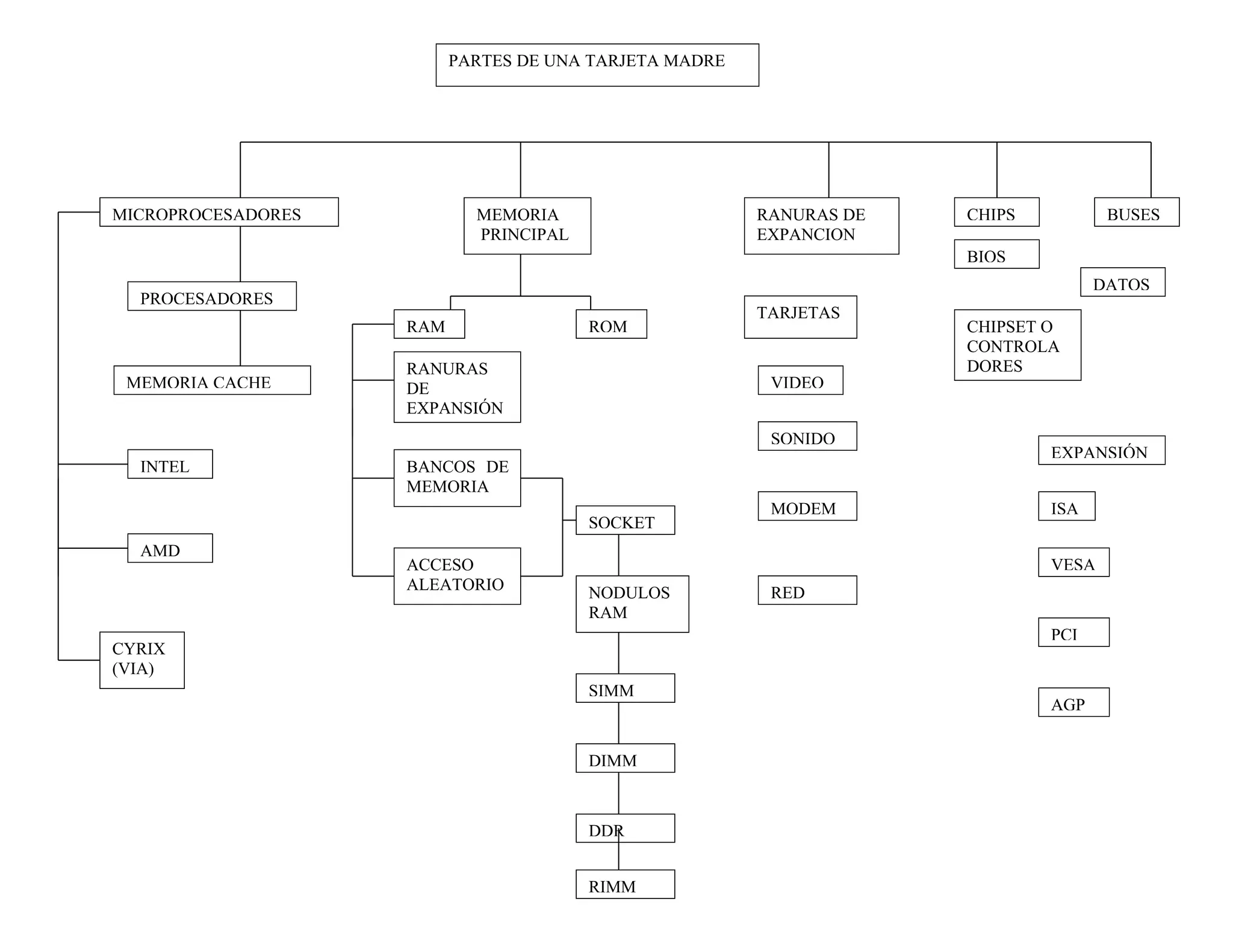 La tarjeta madre contiene el microprocesador, la memoria principal RAM y ROM, ranuras de expansión para tarjetas adicionales de video, sonido, red, etc. y buses que permiten la comunicación entre estos componentes y con periféricos externos a través de puertos de expansión como ISA, PCI, AGP.