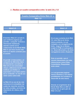 El documento describe la Web 2.0 y cómo permite compartir archivos e información fácilmente entre usuarios, creando una comunidad virtual interactiva. Explica que la Web 2.0 incluye servicios populares como redes sociales y alojamiento de videos. También compara la Web 2.0 con la Web 1.0 más estática que limitaba la participación de los usuarios.