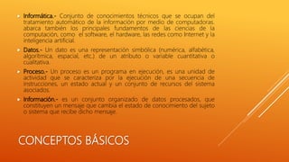 Este documento presenta conceptos básicos de computación como informática, datos, procesos, información, computadoras, software, hardware y memoria. También describe unidades de medida informáticas como bits, bytes y múltiplos. Explica el código ASCII y la unidad de frecuencia hertzios.