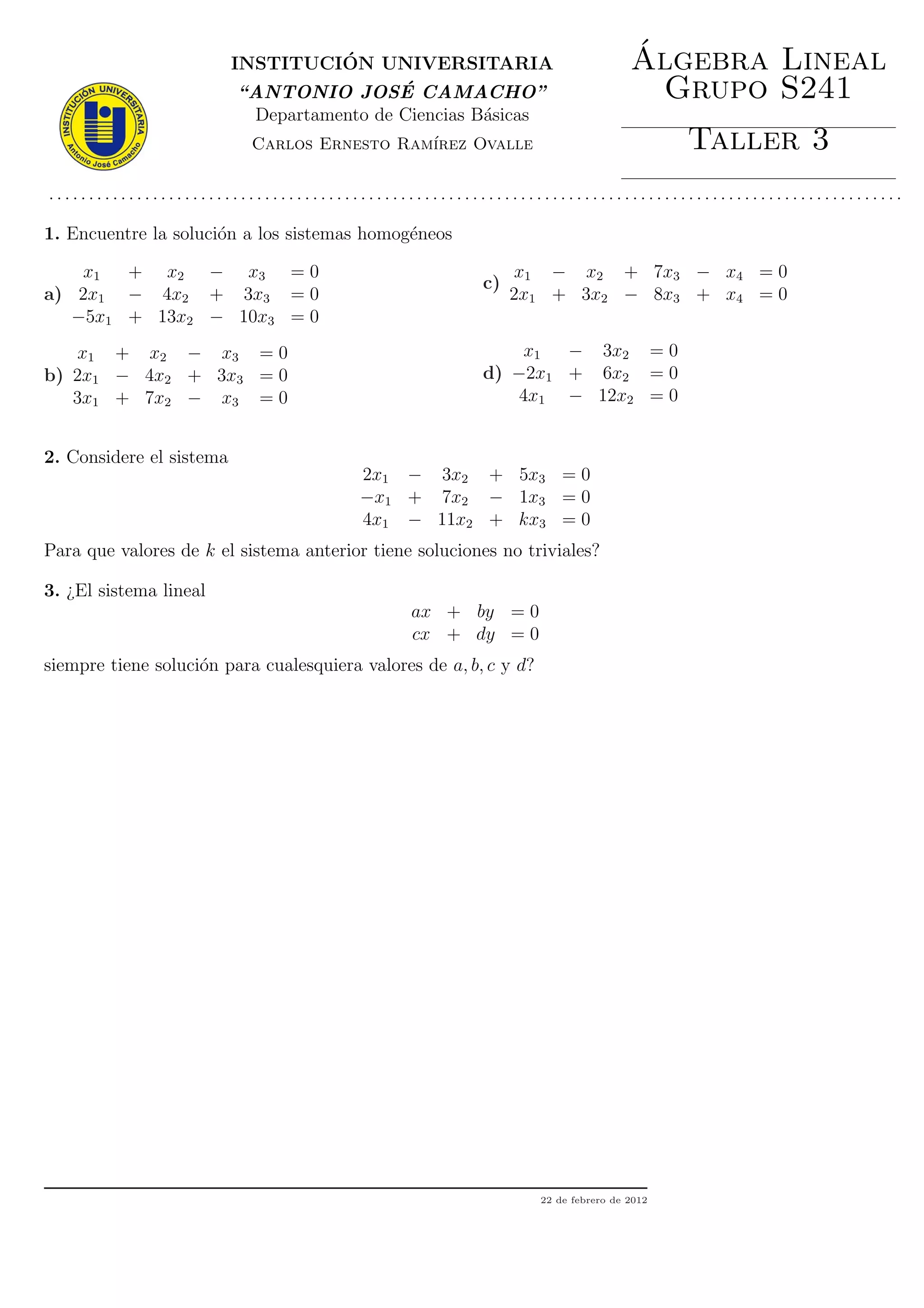 El documento presenta 4 sistemas de ecuaciones homogéneas y lineales para resolver en el Taller 3 de Algebra Lineal. También incluye un sistema de 3 ecuaciones con un parámetro k para determinar los valores que permiten soluciones no triviales, y pregunta si un sistema general de 2 ecuaciones lineales siempre tiene solución para cualquier valor de sus coeficientes.