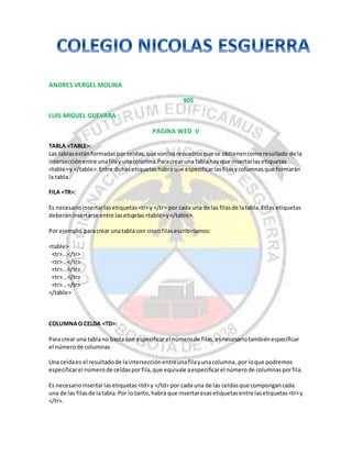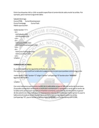 Este documento explica cómo crear tablas en HTML. Las tablas están formadas por celdas que son recuadros resultantes de la intersección entre filas y columnas. Se usan las etiquetas <table>, </table>, <tr>, </tr>, <td> y </td> para especificar el número de filas, columnas y el contenido de cada celda. También se explica cómo modificar atributos de la tabla como el ancho, borde, alineación y colores.