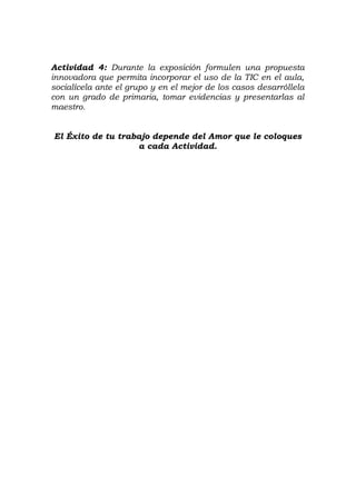 Este documento describe las actividades de un taller sobre la creación de ambientes de aprendizaje creativos con apoyo de las TIC. El objetivo del taller es comprender cómo aplicar las tecnologías de la información y la comunicación para concebir nuevos espacios de aprendizaje diferentes a los tradicionales. Los participantes se dividirán en grupos para investigar temas relacionados con la educación virtual, la educación a distancia, los campus virtuales y más. Cada grupo presentará sus hallazgos en una exposición de 20 minutos y propondrá una innovación para