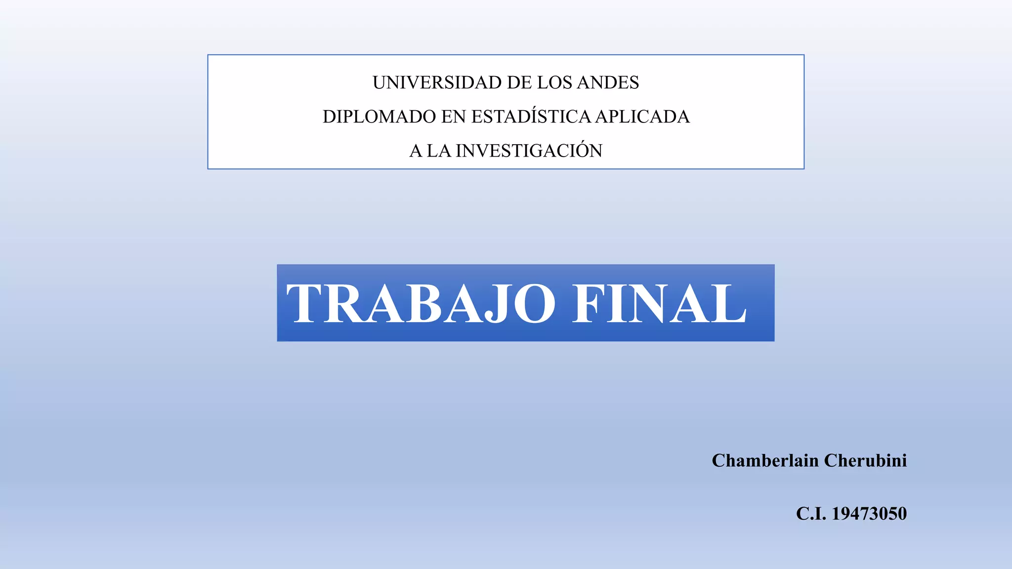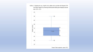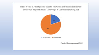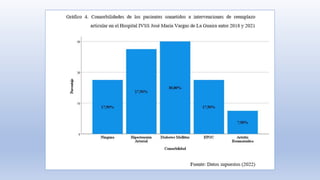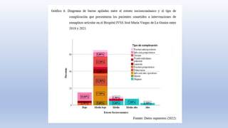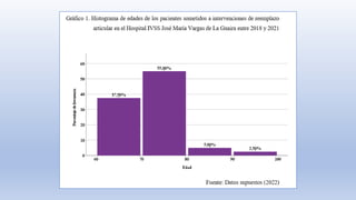 Este documento presenta el trabajo final de un diplomado en estadística aplicada a la investigación. El estudio analiza las complicaciones de las hemiartroplastias de cadera con prótesis de Thompson entre 2018-2021. Los objetivos son describir factores sociodemográficos de pacientes, determinar complicaciones postoperatorias, e interpretar la relación entre resultados clínicos y estrato socioeconómico. El diseño es no experimental y retrospectivo. Se toman muestras de 40 de 52 pacientes.