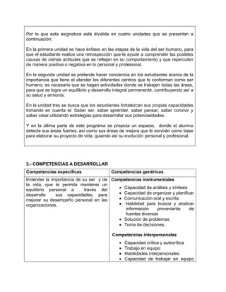Este taller brinda la oportunidad a los estudiantes de reflexionar sobre su vida y desarrollo personal a través de cuatro unidades. La primera unidad analiza las etapas de la vida humana para que los estudiantes comprendan mejor su comportamiento. La segunda unidad cubre las dimensiones del ser humano. La tercera unidad se enfoca en fortalecer las capacidades humanas como el saber ser, saber aprender, saber pensar, saber convivir y saber crear. La cuarta unidad trata sobre el cambio y la elaboración de un proyecto de vida. El objetivo