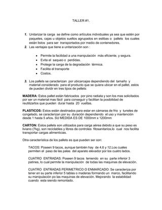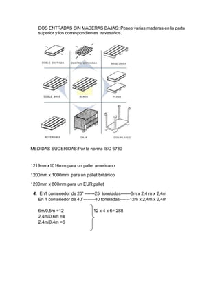 El documento describe los diferentes tipos de pallets y sus características, así como las ventajas de la unitarización de la carga. Explica que los pallets pueden ser de madera, plástico o cartón y tener diferentes configuraciones como tacos o entradas. También proporciona ejemplos de cálculos para empacar y transportar cajas usando contenedores de 20 y 40 pies.