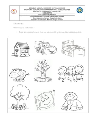 Este documento presenta una guía para cuatro talleres educativos dirigidos a estudiantes de preescolar. Cada taller incluye tres actividades enfocadas en explorar la naturaleza, plantas, animales y la familia a través de conversaciones, videos, dibujos y juegos. El objetivo es que los estudiantes reconozcan e identifiquen los seres vivos y no vivos de su entorno natural y social.
