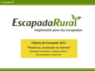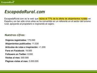 El documento presenta estrategias y consejos prácticos para promocionar alojamientos rurales en internet, enfocándose en la creación de una web efectiva, el uso de blogs y redes sociales. Destaca la importancia de conocer el mercado y optimizar recursos para atraer clientes, así como la necesidad de medir resultados y gestionar la reputación online. También se abordan aspectos de fidelización del cliente y el diseño de ofertas atractivas para mejorar las reservas.