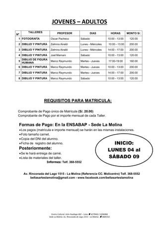 Este documento presenta los diferentes talleres de arte que se ofrecerán en mayo en el Centro Cultural de La Molina, incluyendo talleres de guitarra, teatro, dibujo y pintura, fotografía y más para niños, jóvenes y adultos con diferentes horarios y profesores. Se proporciona información sobre los requisitos de matrícula, forma y lugar de pago e informes de contacto.