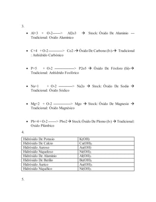 Este documento presenta información sobre óxidos, hidróxidos, ácidos y sales. Incluye listas de óxidos clasificados como básicos o ácidos, ecuaciones químicas para la formación de óxidos e hidróxidos metálicos y no metálicos, y ejercicios para completar ecuaciones químicas y nombrar compuestos como ácidos, bases y sales.