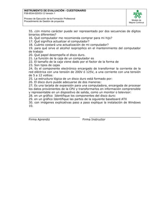 Este documento presenta un cuestionario de evaluación para un aprendiz sobre el mantenimiento de computadores. Contiene 30 preguntas sobre temas como los tipos de mantenimiento, componentes internos de una PC, herramientas para mantenimiento, y cuidados básicos del computador. El aprendiz debe responder al cuestionario y enviarlo a su instructor antes de la fecha límite indicada.